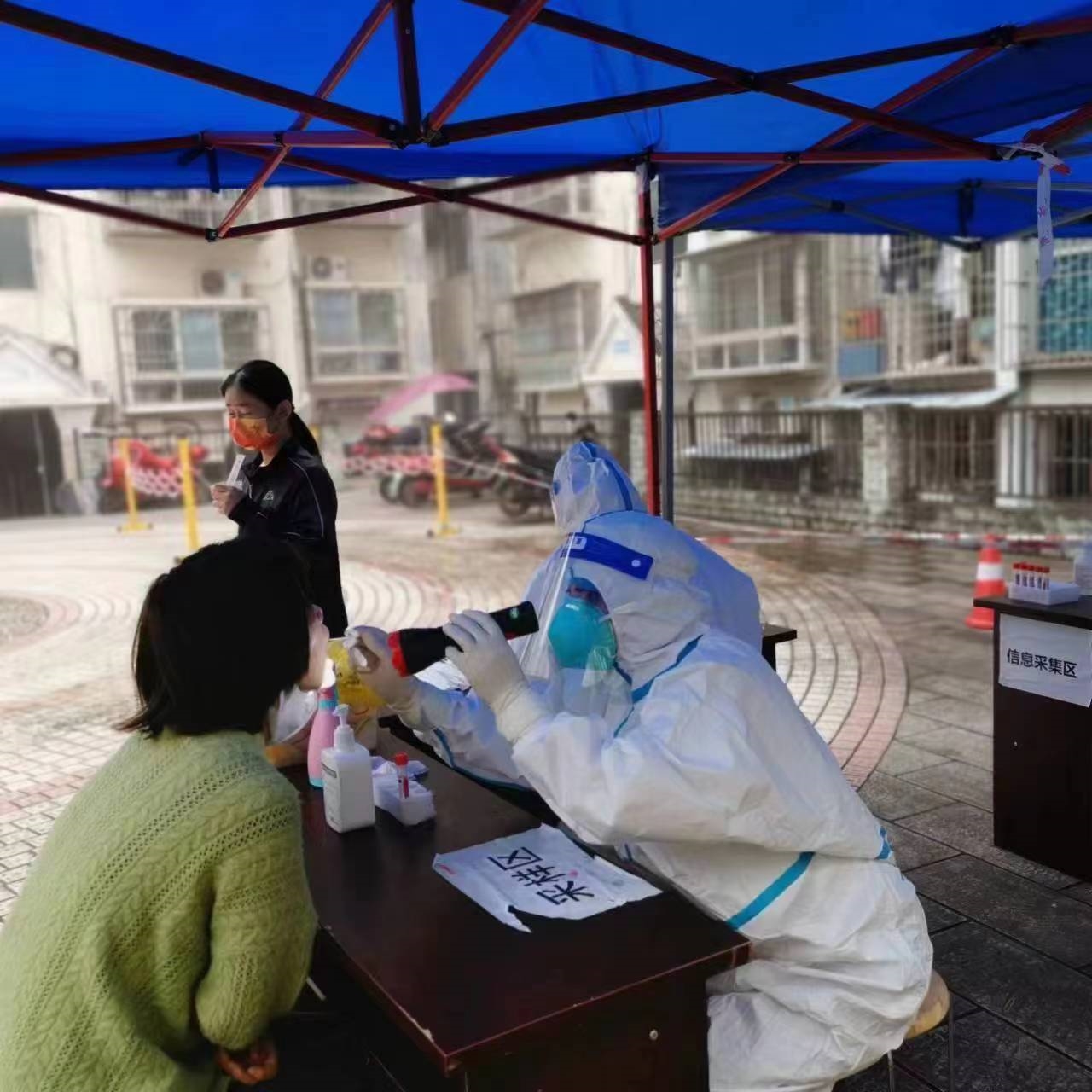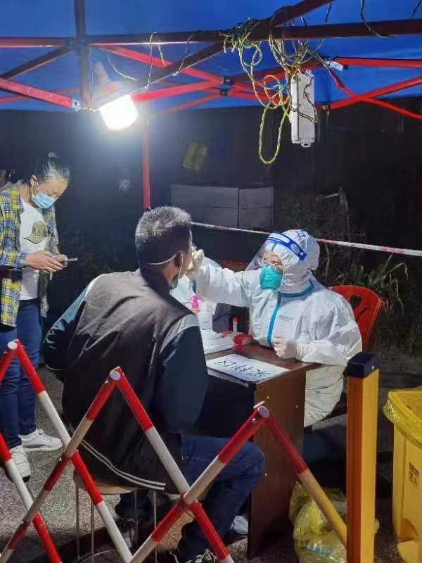 9月23日凌晨,天空下著淅瀝瀝的下雨,凌晨三點的蓬溪顯得異常的冷,可是農工黨蓬溪縣總支黨員王春桃的心里卻是激動的,因為她即將踏上援遂的大巴車,和有著同樣目標的志愿者一起奔赴抗疫一線。王春桃所在的隊伍負責支援明月麗景,她擔任的是核酸采樣工作。天還沒亮,她著手準備,很快進入了工作狀態,按壓酒精進行手部消毒,拿出咽拭子,抬手采樣……動作麻利熟練,整個過程不到16秒。上千次相同動作的不斷重復,手臂發酸發麻,但依然不會停下。她說:“這種流水線式的機械動作會一直持續到整個小區全部完成核酸采樣,能少休息一會,就能早點完成任務,就能為核酸檢測爭取到更多的時間,才能更早打贏這場抗疫戰爭”。